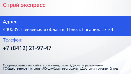 Строй экспресс по адресу 440039, Пензенская область, Пенза, Гагарина, 7 к4 в дальнейшем Организация, размещена в следующих категориях: