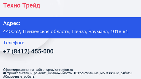 Техно Трейд по адресу 440052, Пензенская область, Пенза, Баумана, 101в к1 в дальнейшем Организация, размещена в следующих категориях: