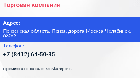 Торговая компания по адресу Пензенская область, Пенза, дорога Москва-Челябинск, 630/3 в дальнейшем Организация, размещена в следующих категориях: