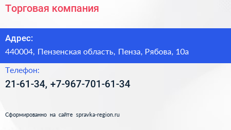 Торговая компания по адресу 440004, Пензенская область, Пенза, Рябова, 10а в дальнейшем Организация, размещена в следующих категориях: