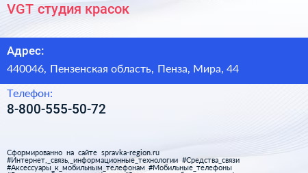 VGT, студия красок по адресу 440046, Пензенская область, Пенза, Мира, 44 в дальнейшем Организация, размещена в следующих категориях: