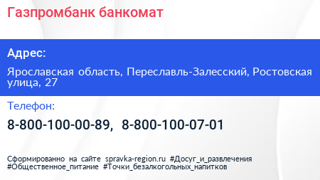 Газпромбанк, банкомат по адресу Ярославская область, Переславль-Залесский, Ростовская улица, 27 в дальнейшем Организация, размещена в следующих категориях: