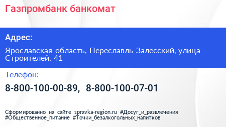 Газпромбанк, банкомат по адресу Ярославская область, Переславль-Залесский, улица Строителей, 41 в дальнейшем Организация, размещена в следующих категориях: