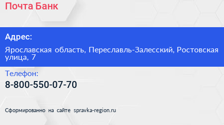 Почта Банк по адресу Ярославская область, Переславль-Залесский, Ростовская улица, 7 в дальнейшем Организация, размещена в следующих категориях:
