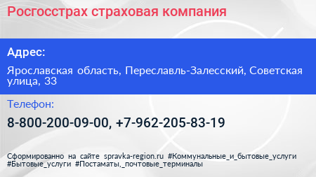 Росгосстрах, страховая компания по адресу Ярославская область, Переславль-Залесский, Советская улица, 33 в дальнейшем Организация, размещена в следующих категориях: