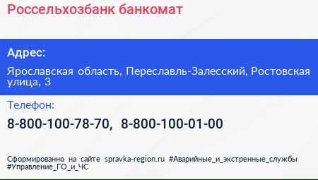 Россельхозбанк, банкомат по адресу Ярославская область, Переславль-Залесский, Ростовская улица, 3 в дальнейшем Организация, размещена в следующих категориях:
