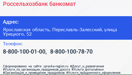 Россельхозбанк, банкомат по адресу Ярославская область, Переславль-Залесский, улица Урицкого, 52 в дальнейшем Организация, размещена в следующих категориях:
