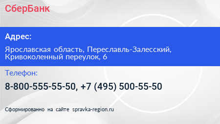 СберБанк по адресу Ярославская область, Переславль-Залесский, Кривоколенный переулок, 6 в дальнейшем Организация, размещена в следующих категориях: