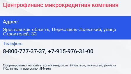 Центрофинанс, микрокредитная компания по адресу Ярославская область, Переславль-Залесский, улица Строителей, 30 в дальнейшем Организация, размещена в следующих категориях: