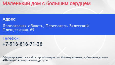 Маленький дом с большим сердцем по адресу Ярославская область, Переславль-Залесский, Плещеевская, 69 в дальнейшем Организация, размещена в следующих категориях:
