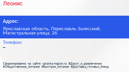 Леонис по адресу Ярославская область, Переславль-Залесский, Магистральная улица, 26 в дальнейшем Организация, размещена в следующих категориях: