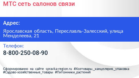 МТС, сеть салонов связи по адресу Ярославская область, Переславль-Залесский, улица Менделеева, 21 в дальнейшем Организация, размещена в следующих категориях: