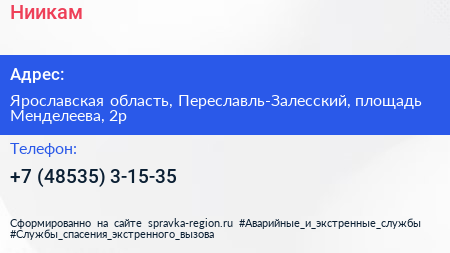 Ниикам по адресу Ярославская область, Переславль-Залесский, площадь Менделеева, 2р в дальнейшем Организация, размещена в следующих категориях: