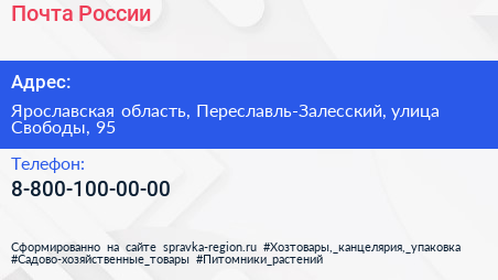 Почта России по адресу Ярославская область, Переславль-Залесский, улица Свободы, 95 в дальнейшем Организация, размещена в следующих категориях: