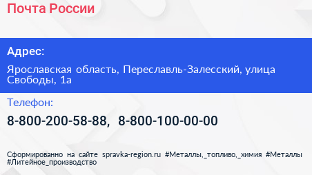 Почта России по адресу Ярославская область, Переславль-Залесский, улица Свободы, 1а в дальнейшем Организация, размещена в следующих категориях: