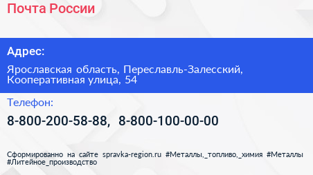 Почта России по адресу Ярославская область, Переславль-Залесский, Кооперативная улица, 54 в дальнейшем Организация, размещена в следующих категориях: