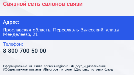 Связной, сеть салонов связи по адресу Ярославская область, Переславль-Залесский, улица Менделеева, 21 в дальнейшем Организация, размещена в следующих категориях: