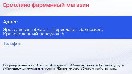 Ермолино, фирменный магазин по адресу Ярославская область, Переславль-Залесский, Кривоколенный переулок, 5 в дальнейшем Организация, размещена в следующих категориях: