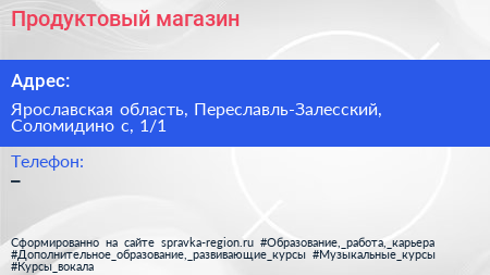 Продуктовый магазин по адресу Ярославская область, Переславль-Залесский, Соломидино с, 1/1 в дальнейшем Организация, размещена в следующих категориях: