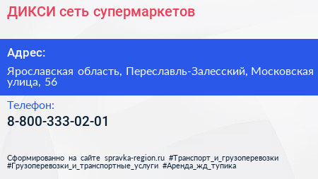 ДИКСИ, сеть супермаркетов по адресу Ярославская область, Переславль-Залесский, Московская улица, 56 в дальнейшем Организация, размещена в следующих категориях: