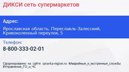ДИКСИ, сеть супермаркетов по адресу Ярославская область, Переславль-Залесский, Кривоколенный переулок, 5 в дальнейшем Организация, размещена в следующих категориях: