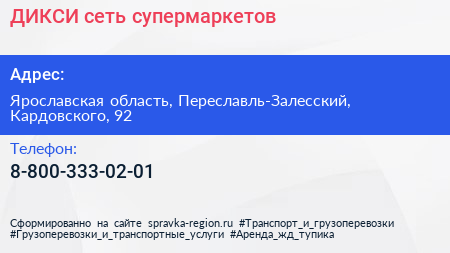 ДИКСИ, сеть супермаркетов по адресу Ярославская область, Переславль-Залесский, Кардовского, 92 в дальнейшем Организация, размещена в следующих категориях: