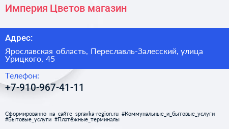 Империя Цветов, магазин по адресу Ярославская область, Переславль-Залесский, улица Урицкого, 45 в дальнейшем Организация, размещена в следующих категориях: