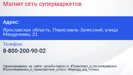 Магнит, сеть супермаркетов по адресу Ярославская область, Переславль-Залесский, улица Менделеева, 21 в дальнейшем Организация, размещена в следующих категориях:
