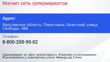 Магнит, сеть супермаркетов по адресу Ярославская область, Переславль-Залесский, улица Свободы, 48Б в дальнейшем Организация, размещена в следующих категориях: