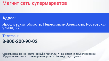 Магнит, сеть супермаркетов по адресу Ярославская область, Переславль-Залесский, Ростовская улица, 27 в дальнейшем Организация, размещена в следующих категориях: