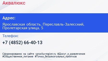 Аквалюкс+ по адресу Ярославская область, Переславль-Залесский, Пролетарская улица, 5 в дальнейшем Организация, размещена в следующих категориях: