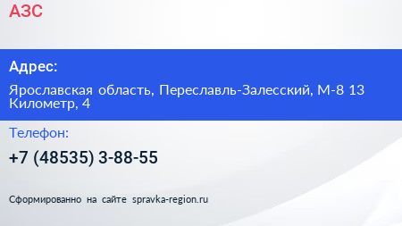 АЗС по адресу Ярославская область, Переславль-Залесский, М-8 13 Километр, 4 в дальнейшем Организация, размещена в следующих категориях: