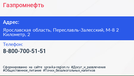 Газпромнефть по адресу Ярославская область, Переславль-Залесский, М-8 2 Километр, 2 в дальнейшем Организация, размещена в следующих категориях: