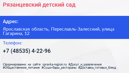 Рязанцевский детский сад по адресу Ярославская область, Переславль-Залесский, улица Гагарина, 12 в дальнейшем Организация, размещена в следующих категориях: