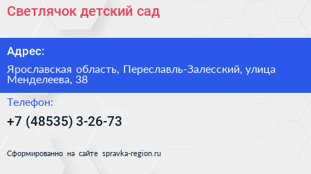 Светлячок, детский сад по адресу Ярославская область, Переславль-Залесский, улица Менделеева, 38 в дальнейшем Организация, размещена в следующих категориях: