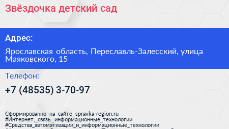 Звёздочка, детский сад по адресу Ярославская область, Переславль-Залесский, улица Маяковского, 15 в дальнейшем Организация, размещена в следующих категориях: