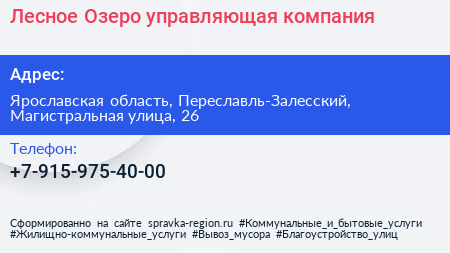Лесное Озеро, управляющая компания по адресу Ярославская область, Переславль-Залесский, Магистральная улица, 26 в дальнейшем Организация, размещена в следующих категориях: