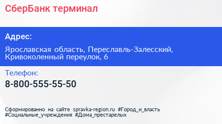 СберБанк, терминал по адресу Ярославская область, Переславль-Залесский, Кривоколенный переулок, 6 в дальнейшем Организация, размещена в следующих категориях: