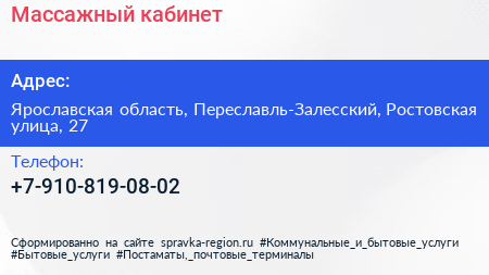 Массажный кабинет по адресу Ярославская область, Переславль-Залесский, Ростовская улица, 27 в дальнейшем Организация, размещена в следующих категориях: