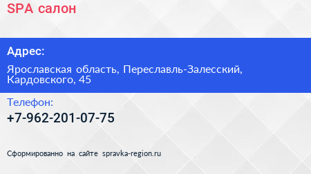 SPA-салон по адресу Ярославская область, Переславль-Залесский, Кардовского, 45 в дальнейшем Организация, размещена в следующих категориях: