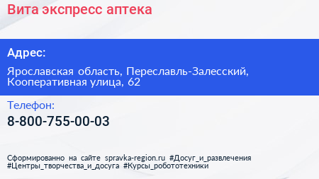 Вита-экспресс, аптека по адресу Ярославская область, Переславль-Залесский, Кооперативная улица, 62 в дальнейшем Организация, размещена в следующих категориях: