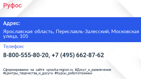 Руфос по адресу Ярославская область, Переславль-Залесский, Московская улица, 105 в дальнейшем Организация, размещена в следующих категориях: