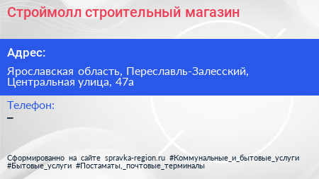 Строймолл, строительный магазин по адресу Ярославская область, Переславль-Залесский, Центральная улица, 47а в дальнейшем Организация, размещена в следующих категориях:
