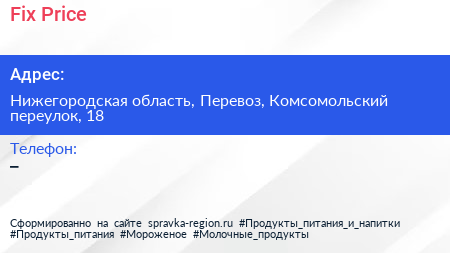 Fix Price по адресу Нижегородская область, Перевоз, Комсомольский переулок, 18 в дальнейшем Организация, размещена в следующих категориях: