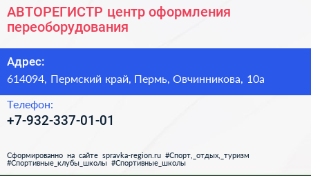 АВТОРЕГИСТР, центр оформления переоборудования по адресу 614094, Пермский край, Пермь, Овчинникова, 10а в дальнейшем Организация, размещена в следующих категориях: