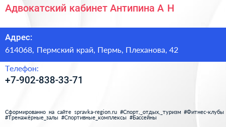 Адвокатский кабинет Антипина А.Н. по адресу 614068, Пермский край, Пермь, Плеханова, 42 в дальнейшем Организация, размещена в следующих категориях: