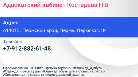 Адвокатский кабинет Костарева Н.В. по адресу 614015, Пермский край, Пермь, Пермская, 34 в дальнейшем Организация, размещена в следующих категориях: