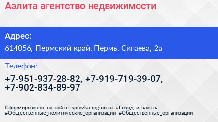 Аэлита, агентство недвижимости по адресу 614056, Пермский край, Пермь, Сигаева, 2а в дальнейшем Организация, размещена в следующих категориях: