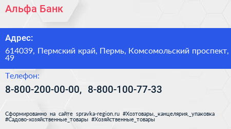 Альфа-Банк по адресу 614039, Пермский край, Пермь, Комсомольский проспект, 49 в дальнейшем Организация, размещена в следующих категориях:
