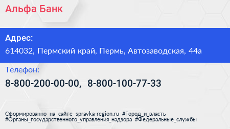Альфа-Банк по адресу 614032, Пермский край, Пермь, Автозаводская, 44а в дальнейшем Организация, размещена в следующих категориях:
